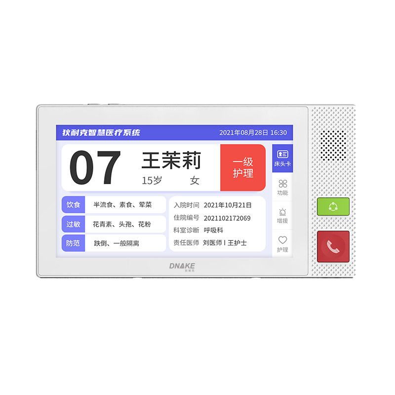 安裝在病床頭的交互設(shè)備機(jī),代替?zhèn)鹘y(tǒng)紙質(zhì)卡。產(chǎn)品支持呼叫對(duì)講、為住院患者提供病例查詢、狀態(tài)自動(dòng)提醒等護(hù)理需求等。