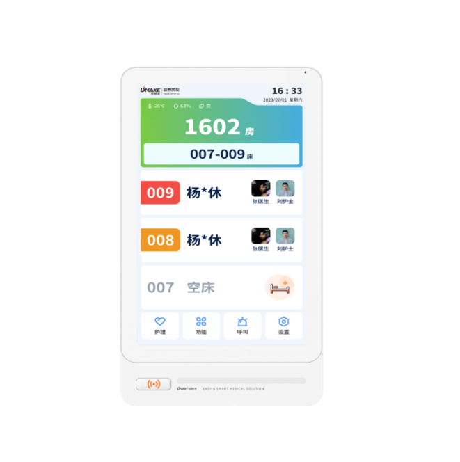 創(chuàng)新設置在病房門口的終端設備,主要用于顯示病房相關信息,內(nèi)置簡易醫(yī)護工作站,支持病房床位一覽、患者動態(tài)跟蹤、呼叫對講、增援求救等多種呼叫類型,信息齊全,及時響應醫(yī)護需求,實現(xiàn)智能化醫(yī)護管理。軟件參數(shù):1)采用多點觸控電容顯示屏,安裝在每個病房門口外的墻壁上,用于顯示病房內(nèi)的患者基本信息,以及護士簡易工作站,如接聽呼叫、未處理事件處置等;一個病房配置一臺,可外接防