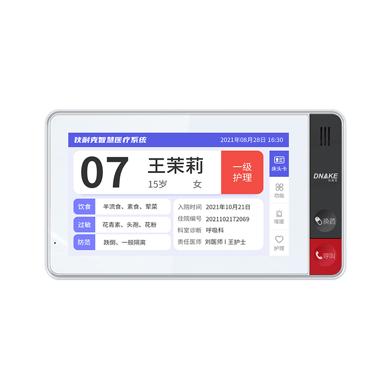 安裝在病床頭的交互設(shè)備機,代替?zhèn)鹘y(tǒng)紙質(zhì)卡。產(chǎn)品支持呼叫對講、為住院患者提供病例查詢、狀態(tài)自動提醒等護理需求等。